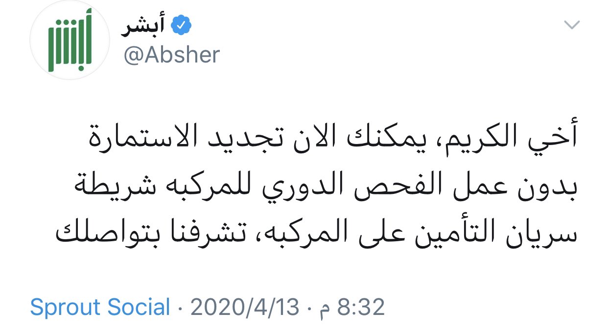طرق الرياض On Twitter أبشر يؤكد على إمكانية تجديد الاستمارة بدون عمل الفحص الدوري للمركبة شريطة سريان التأمين على المركبة Https T Co Pbgxobonaf Https T Co Nridl8epx9